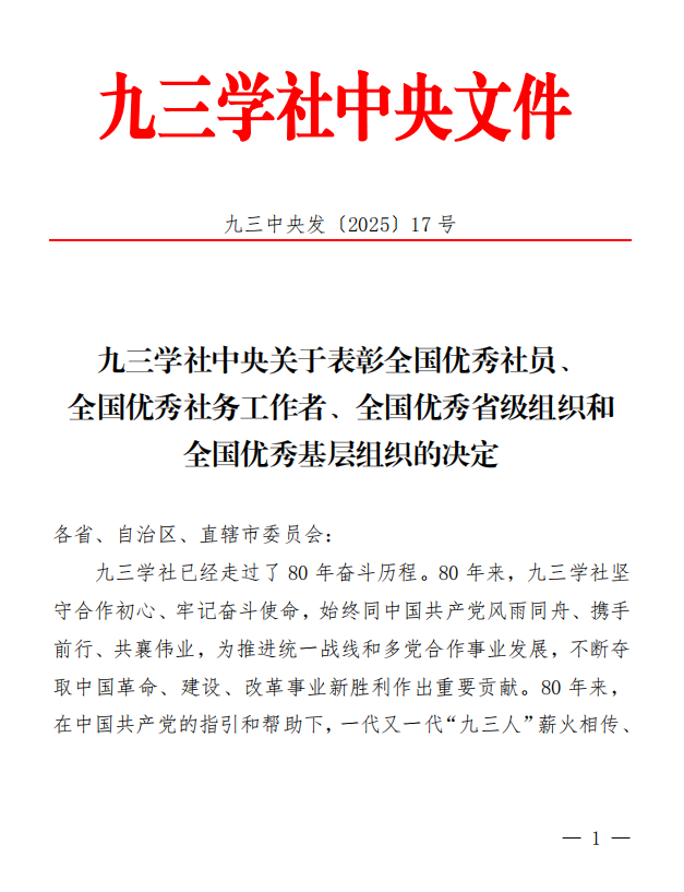 近日,九三学社中央印发《九三学社中央关于表彰全国优秀社员、全国优秀社务工作者、全国优秀省级组织和全国优秀基层组织的决定》,我校九三学社委员会主委刘慧获评“全国优秀社务工作者”,委员会秘书长孙莹获评“全国优秀社员”。