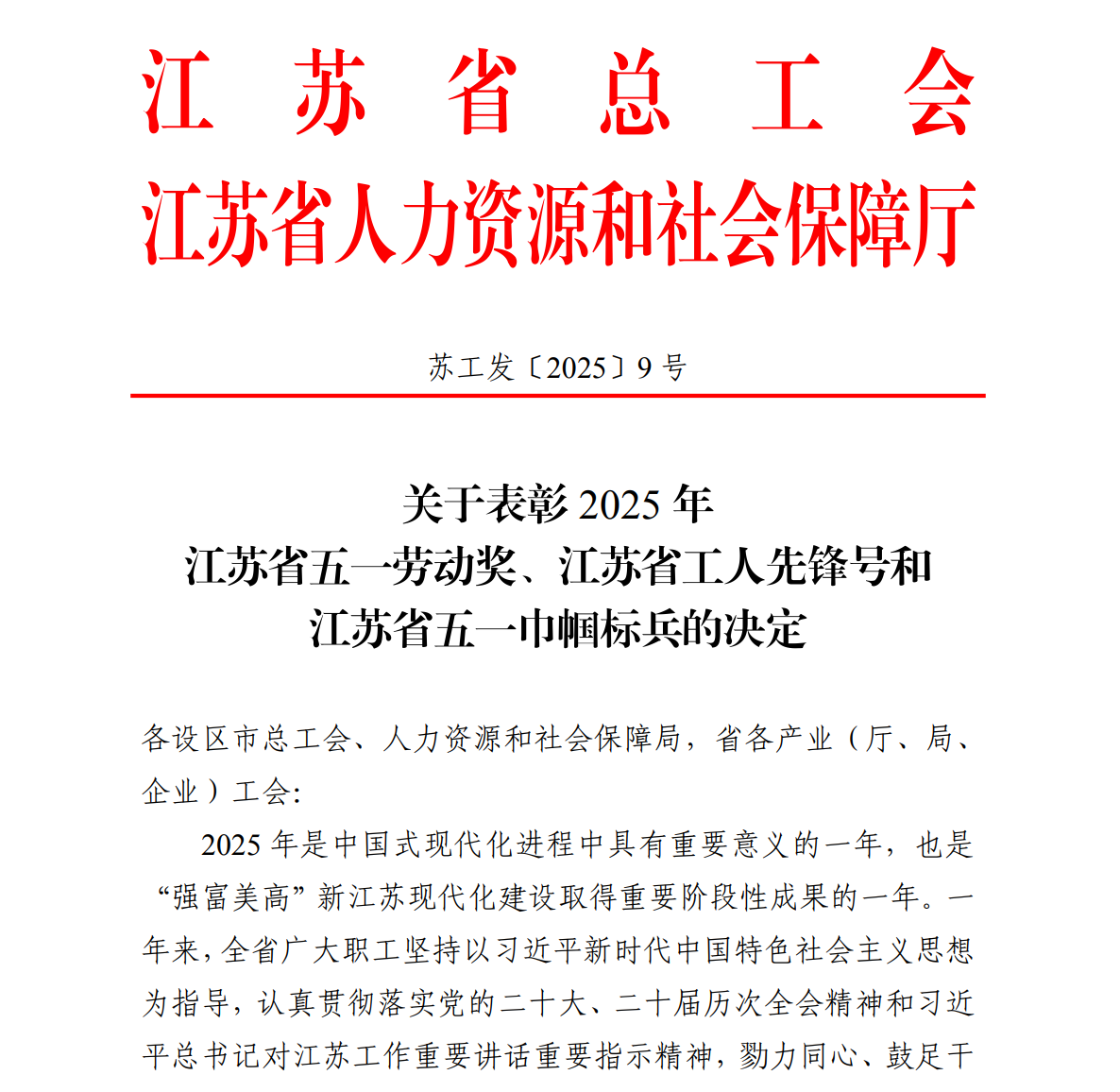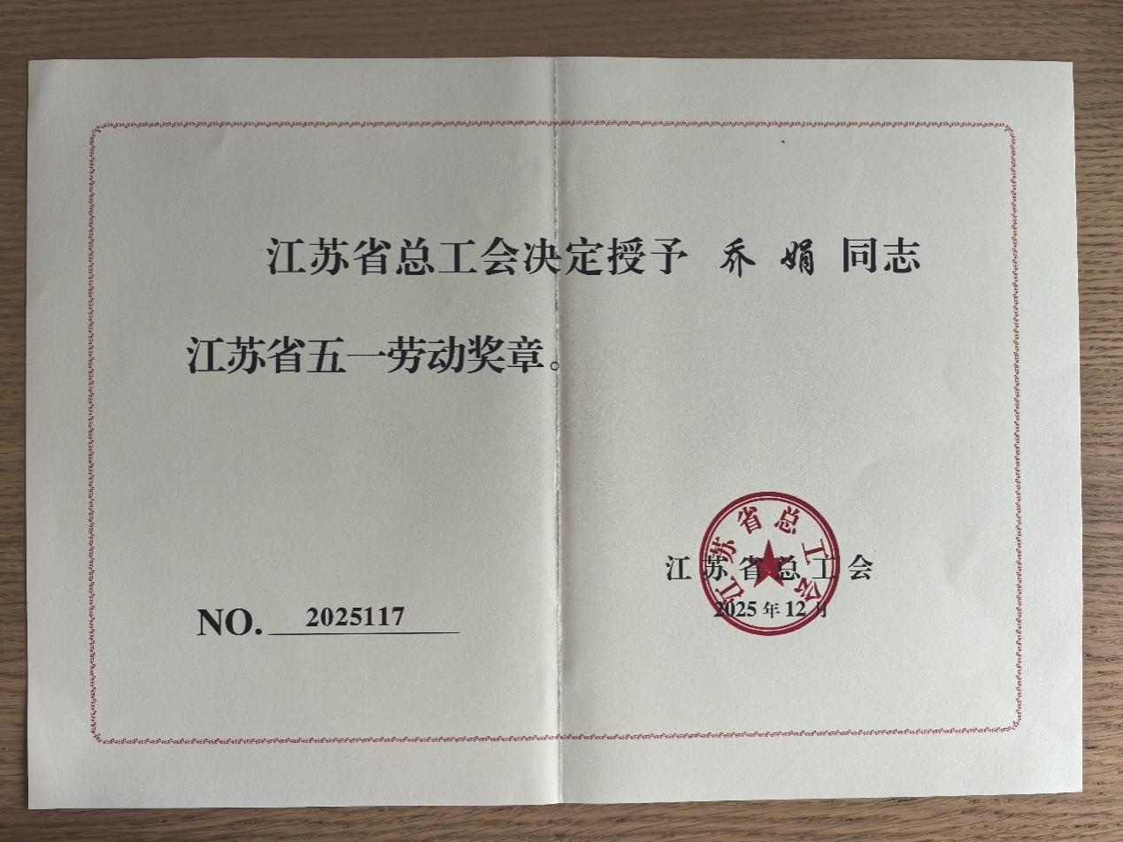 近日,江苏省总工会、江苏省人力资源和社会保障厅联合下发《关于表彰江苏省五一劳动奖、江苏省工人先锋号、江苏省五一巾帼标兵的决定》,我校民盟盟员乔娟博士荣获2025年“江苏省五一劳动奖章”荣誉称号。