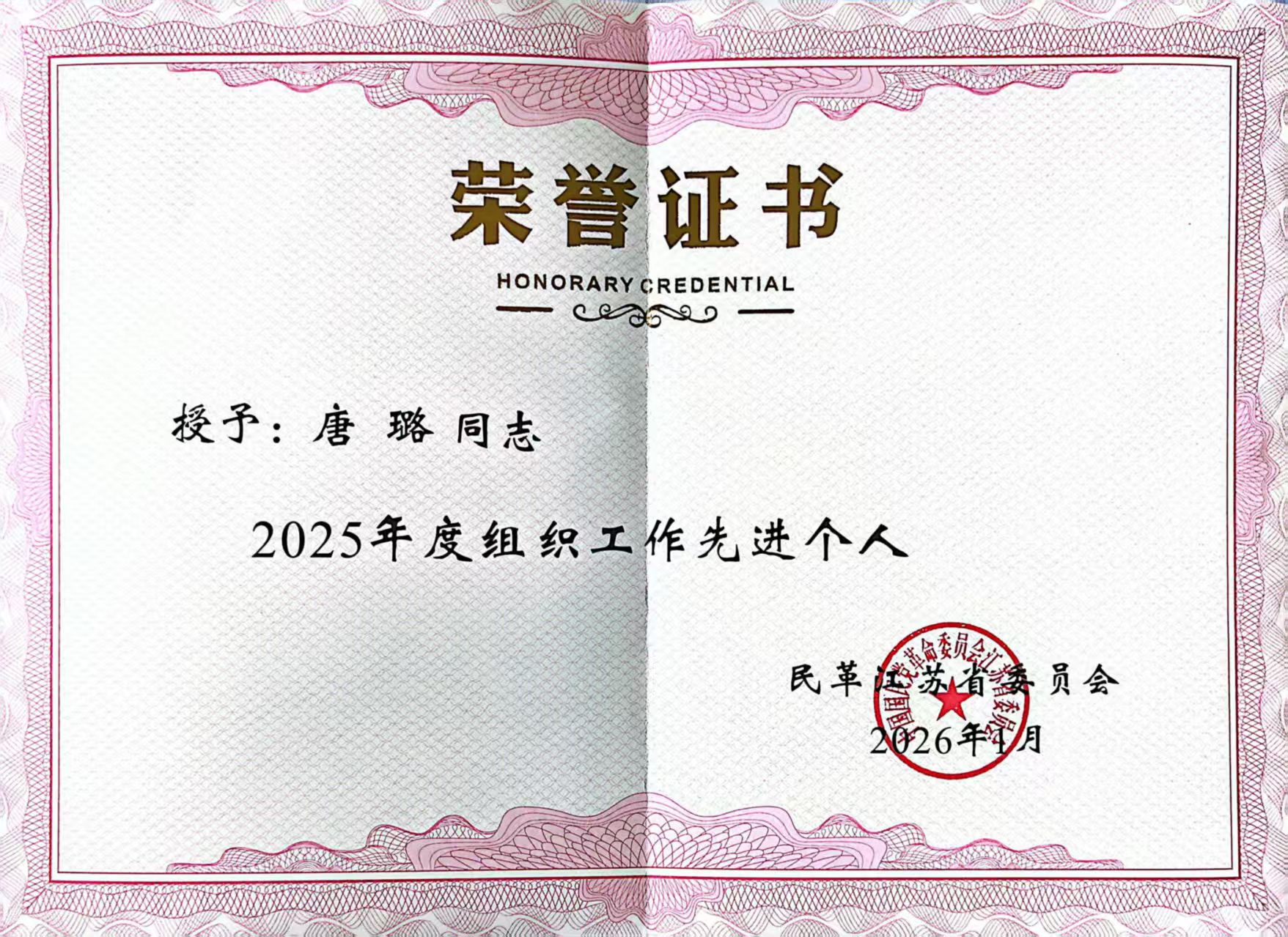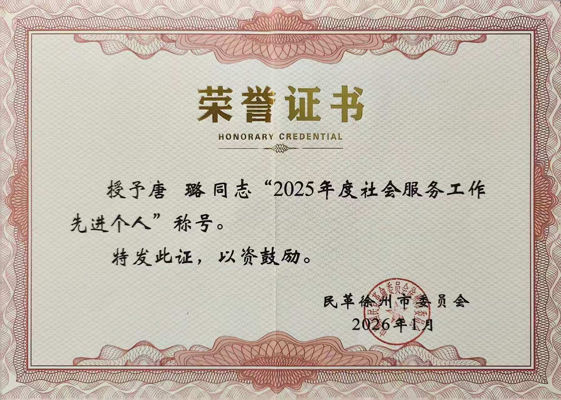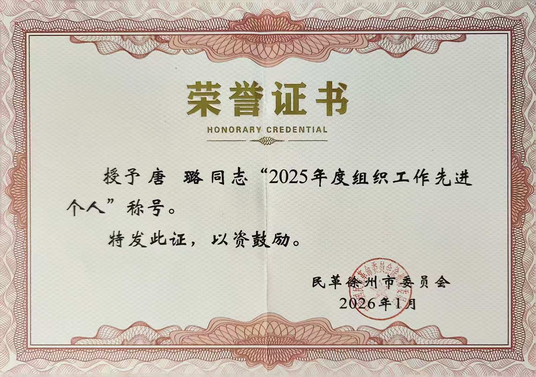 近日,学校民革支部主委、医学影像学院唐璐教授凭借在民革组织工作中的突出表现与深耕育人一线的显著成效,荣获民革省委会“组织工作先进个人”称号,民革徐州市委会2025年度“社会服务工作先进个人”“组织工作先进个人”。